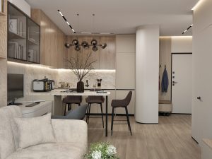 Глянцевый потолок — это зеркальная поверхность, которая отражает интерьер, визуально увеличивая пространство и наполняя его светом. Отличный выбор для небольших комнат, прихожих и ванных. Но требует идеально ровных стен, так как все недочёты будут отражаться.